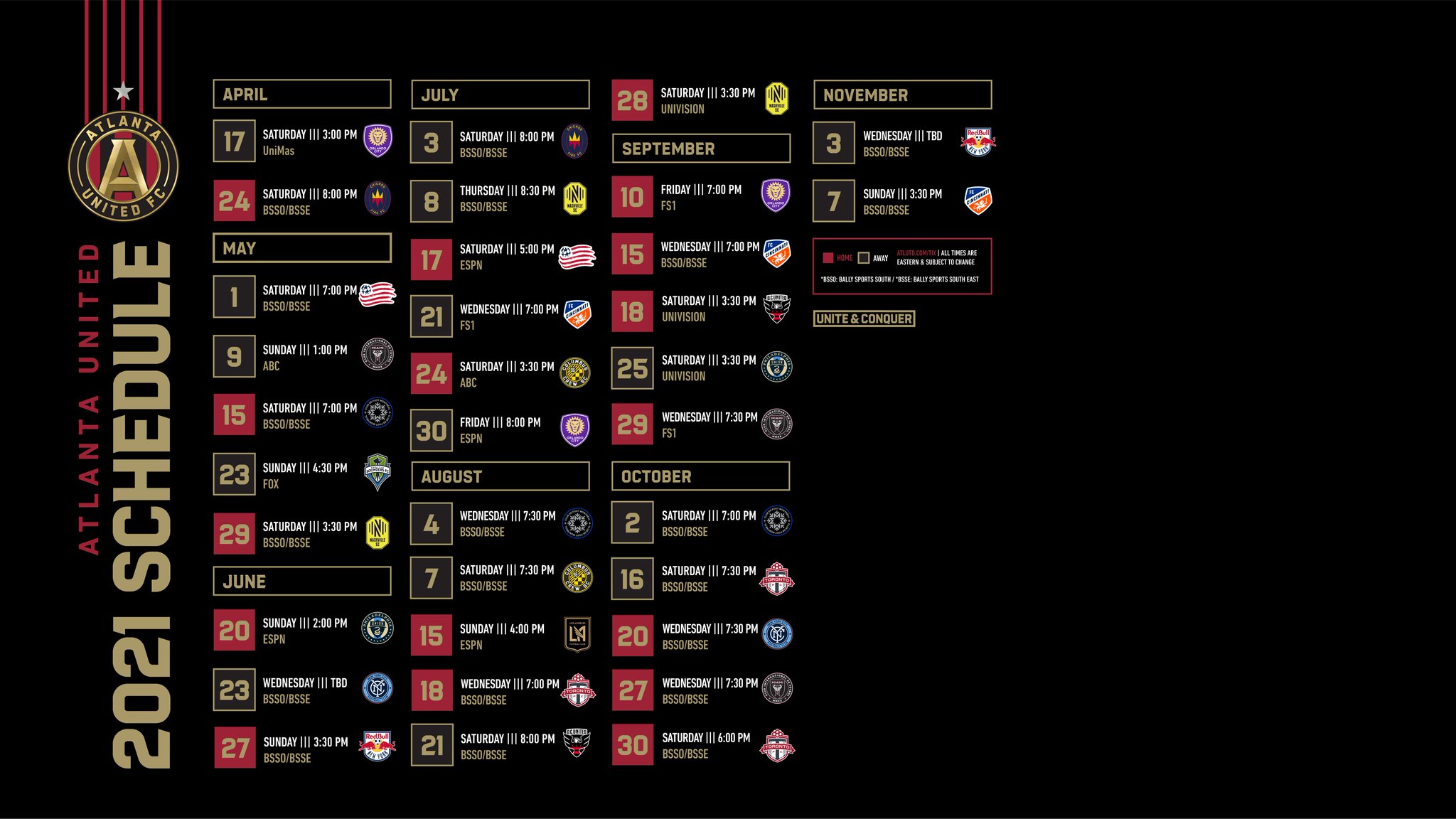 July 23 July 31 at Atlantic Station. Assist with preparation of training or match. Stay tuned for ticket announcements later this year. Major League Soccer announces 2021 schedule Atlanta United to feature on 14 National TV Broadcasts By Atlanta United Communications ATLUTD.